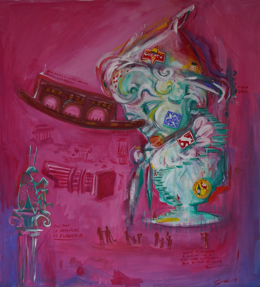 Sara Alarcón reinterprets Italy's classical heritage in modern canvases, using her distorted color technique to evoke the timeless essence of the Renaissance.