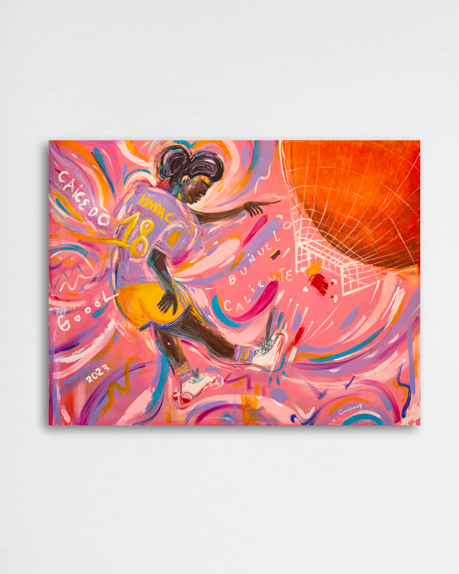 "Buñuelo Caliente" captures the electrifying moment of Linda Caicedo's goal against Germany in the Women's World Cup. In this dynamic artwork, the ball takes the form of a buñuelo, symbolizing Colombian culture and tradition.