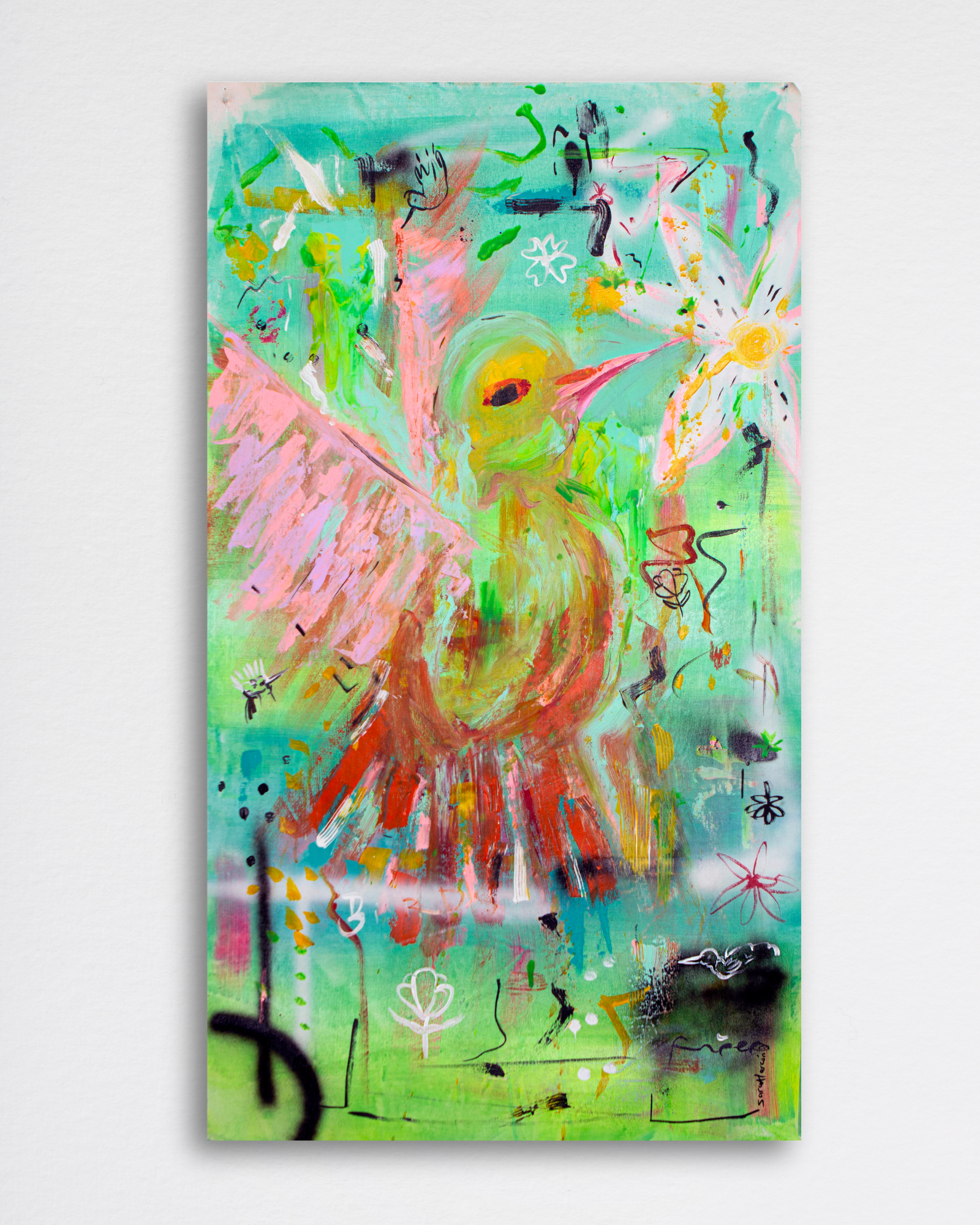 An abstract piece featuring a hummingbird soaring against a vibrant green background. Its fluid strokes and lively colors capture the bird's graceful flight, as if it's dancing in a gentle breeze.