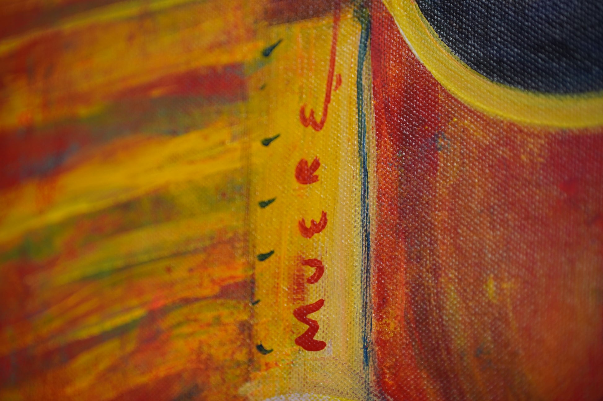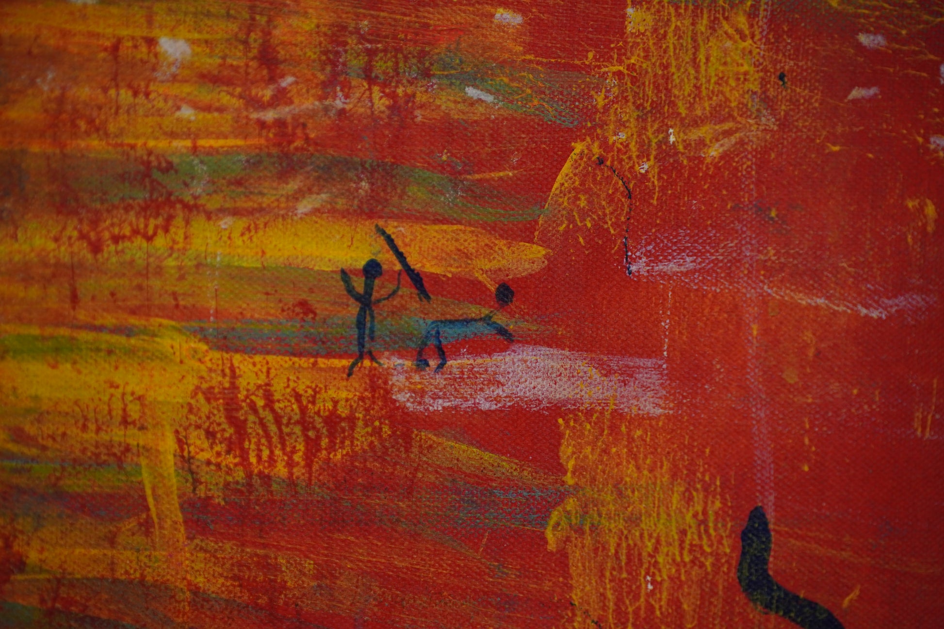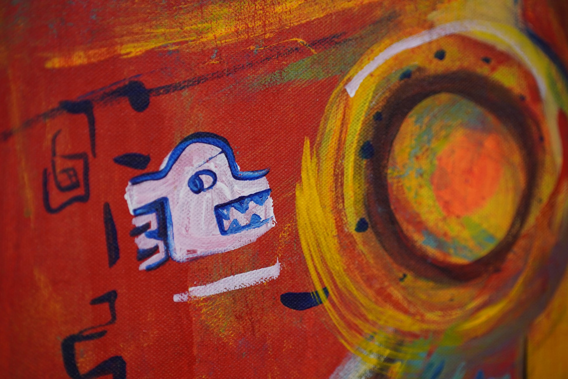 Honoring Inka wisdom where death is not an end, but a doorway. The soul rests in a fetal embrace, a seed waiting to sprout again. The intense red canvas is the eternal horizon simultaneously the sunset of death and the burning sunrise of rebirth.