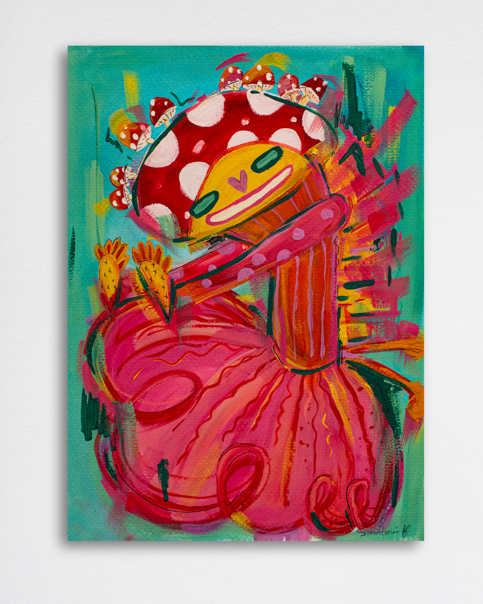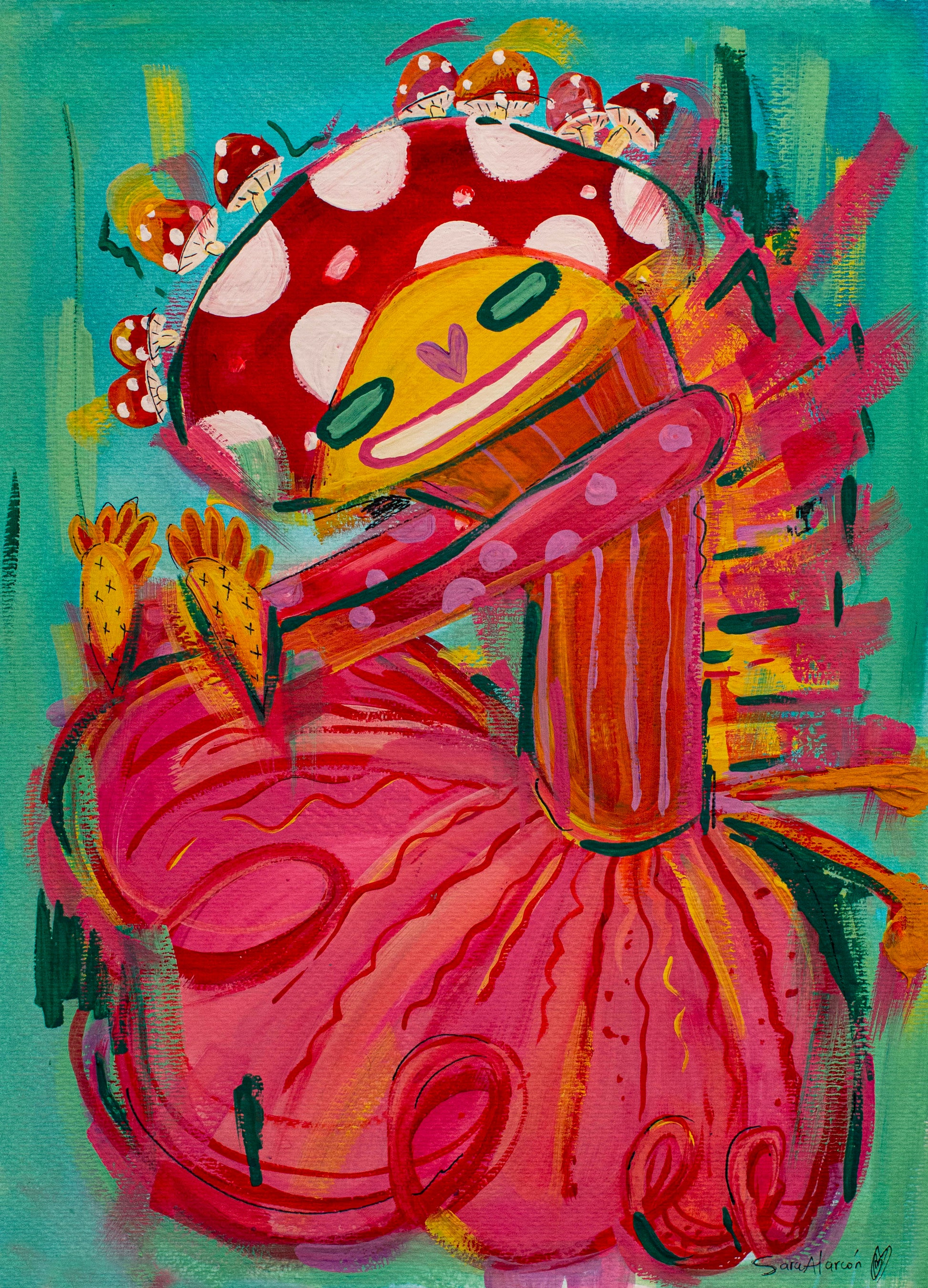 "Dancing Mushroom" features a joyful mushroom character dancing with vibrant colors and playful patterns. Surrounded by smaller mushrooms, this piece celebrates nature's charm and the fun of imaginative moments.""Dancing Mushroom" features a joyful mushroom character dancing with vibrant colors and playful patterns. Surrounded by smaller mushrooms, this piece celebrates nature's charm and the fun of imaginative moments."