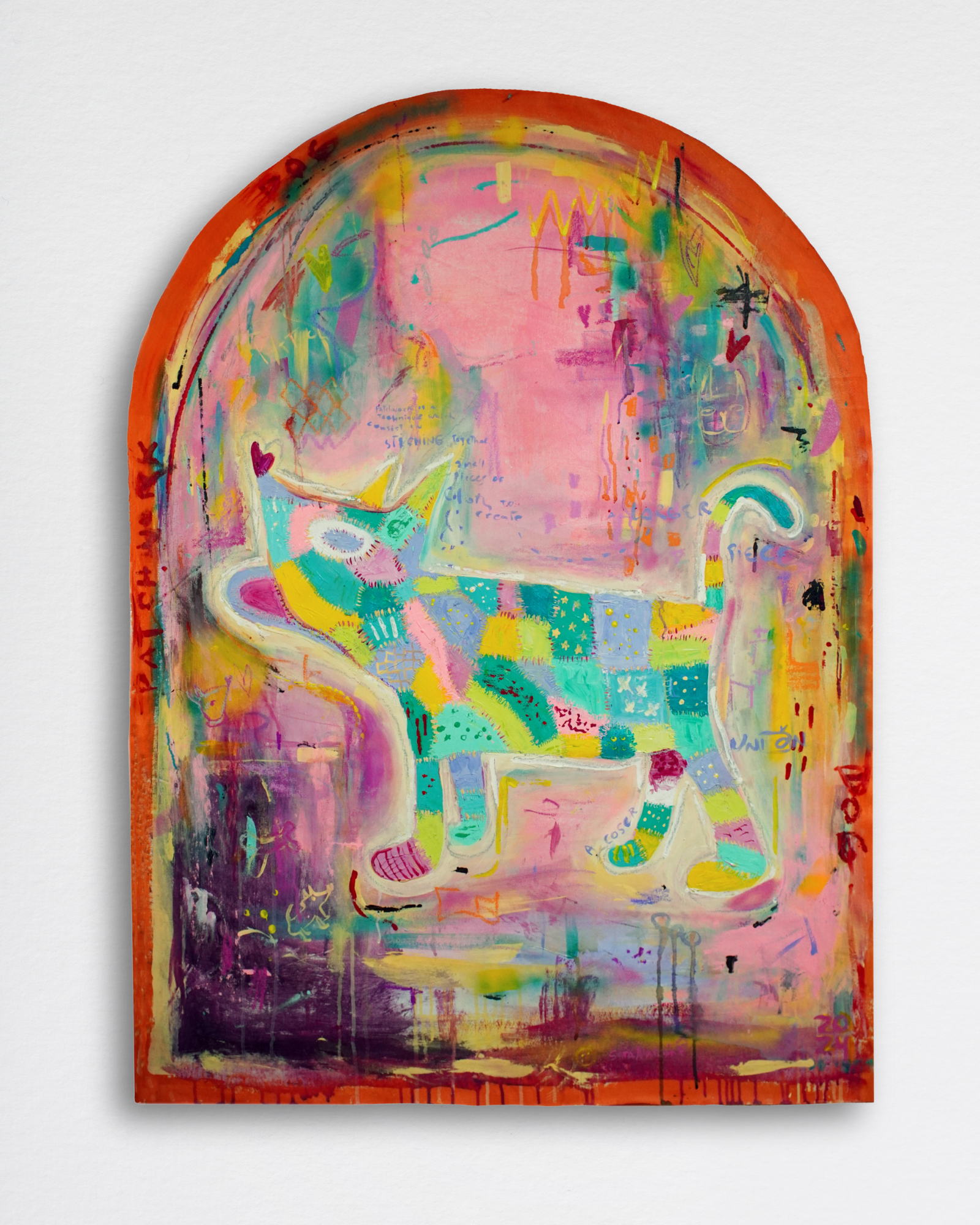 "Dog in Patterns" features a playful dog adorned with a vibrant patchwork of colors and designs. The lively mosaic and dynamic background capture the joy and whimsy of a happy canine, celebrating creativity and imagination.