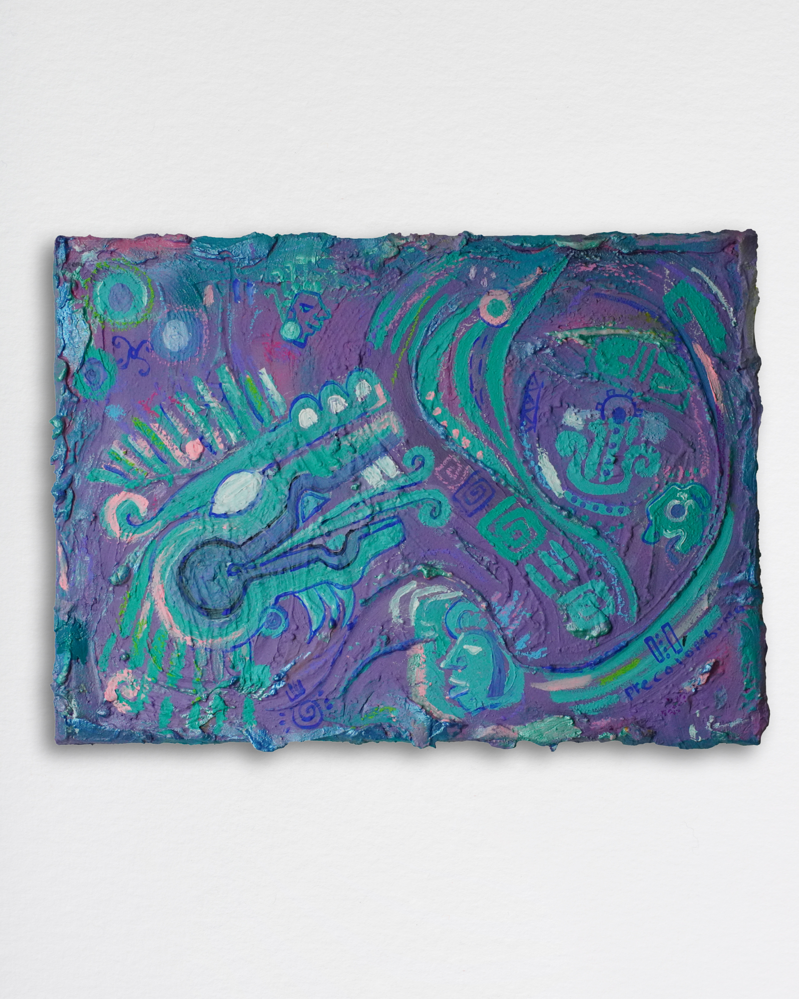 “Ancestral Dragon” is a colorful work inspired by Olmec culture. The painting features a spiraling dragon surrounded by ancient symbols, with flowing lines and detailed patterns. The textured plaster simulates an archaeological discovery and explores the timeless legacy of the Olmecs.