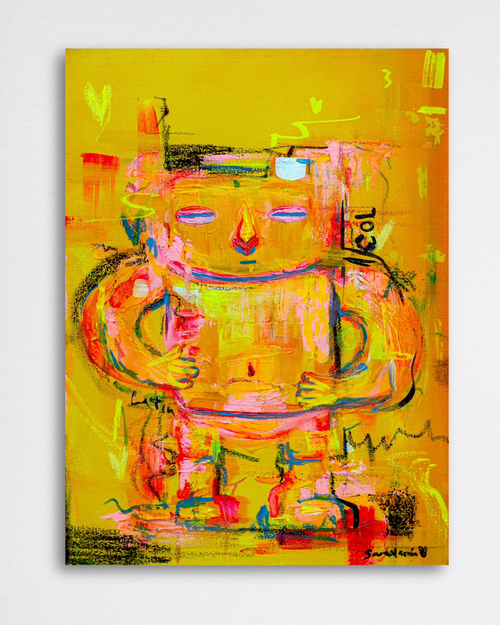 "Espectro precolombino" showcases a pre-Columbian figure against a luminous yellow backdrop, exuding timeless majesty.