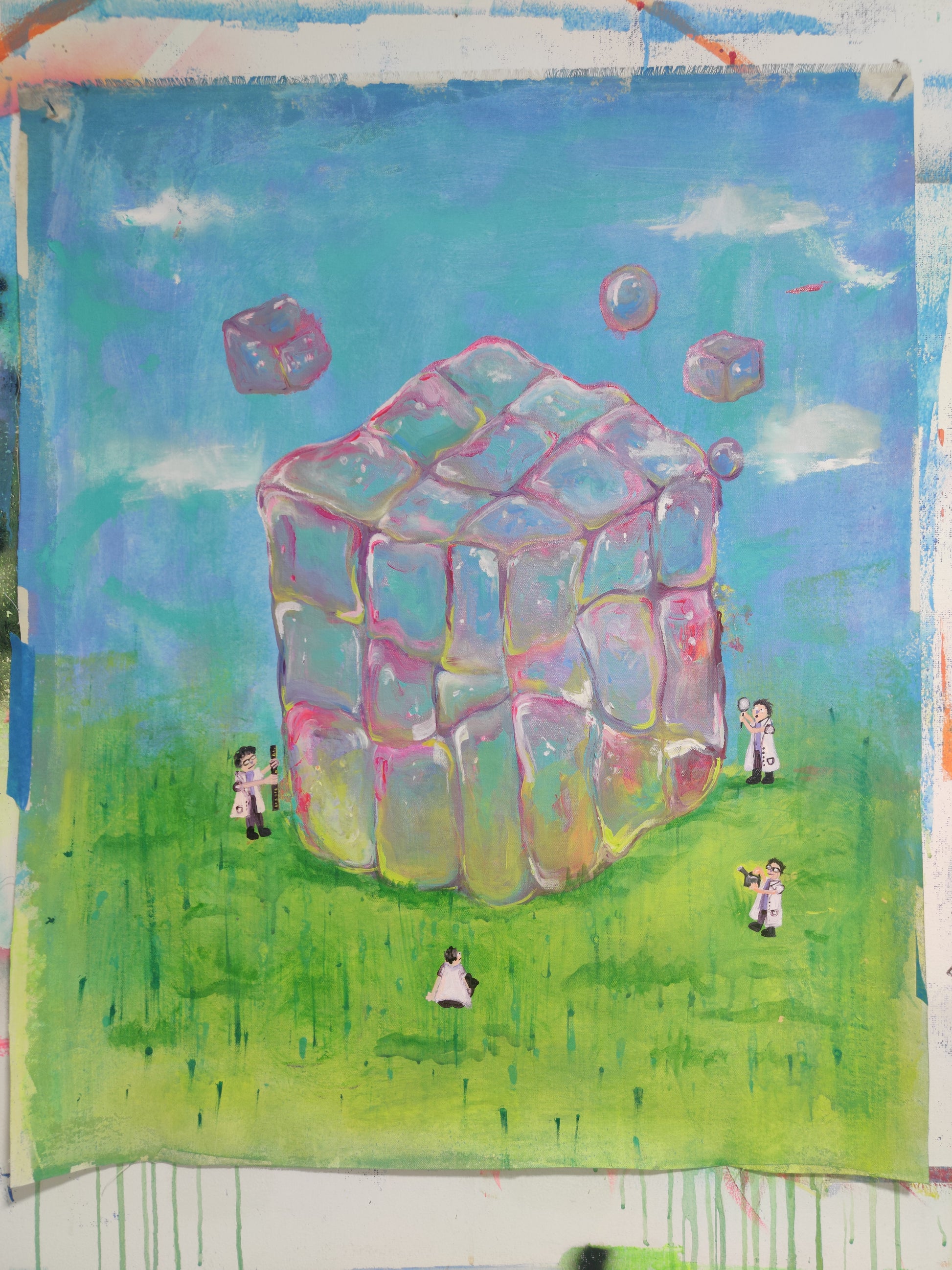 "Lab of Dreams" portrays a vivid, dream-inspired scene in a scientific lab, focusing on an ordinary soap cube under intense scrutiny. This artwork captures the whimsy of how inspiration can spring from the most unexpected sources, encouraging us to value the creative potential of our dreams.