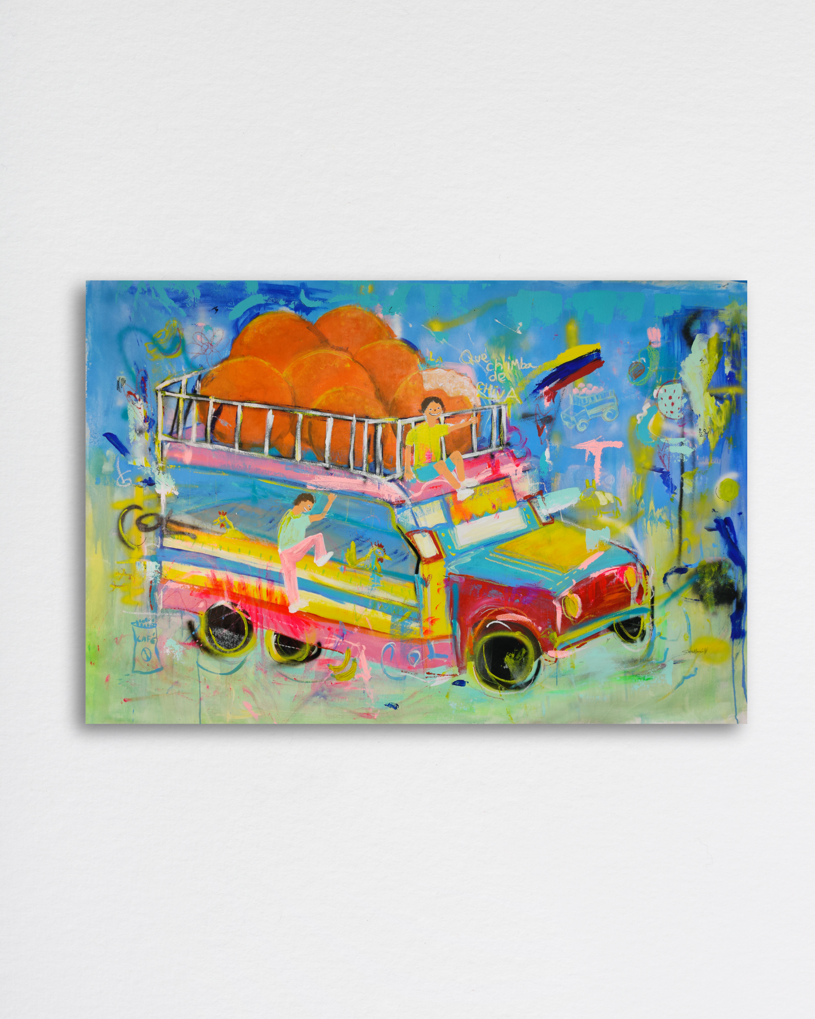 "Que chimba de chiva" captures a whimsical Colombian chiva bus, vividly painted and joyously loaded with buñuelos, hens, and people.