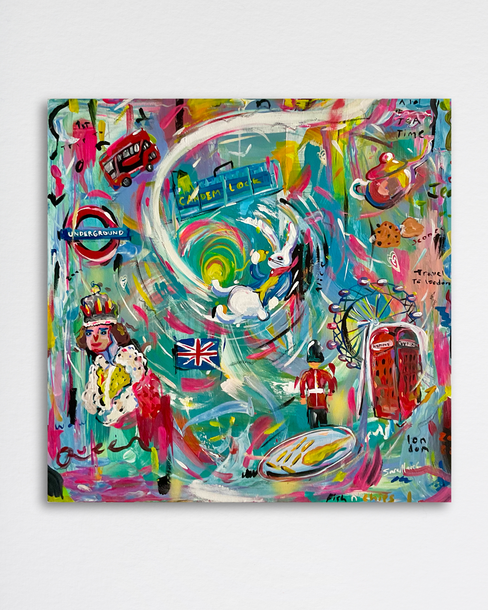 I painted the view of London through the eyes of Alice's rabbit and my own. It was my first time in the city, and I wanted to give it a unique twist with vibrant colors and dynamic movement, capturing the essence of Britain and its distinct symbols.