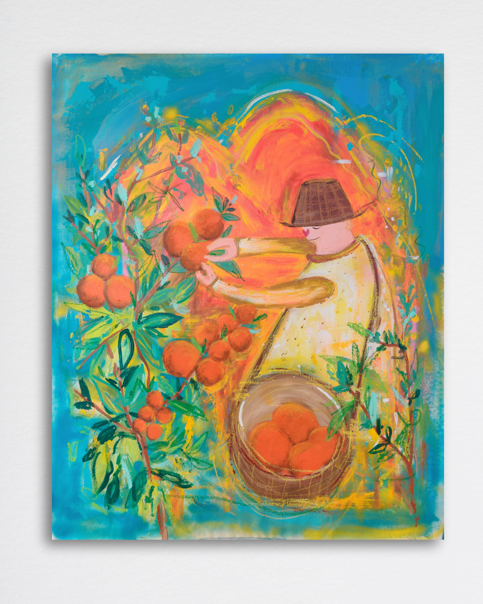 "Racimo de buñuelos" depicts a vibrant scene where a person gathers not coffee beans, but buñuelos, from the laden branches of what would traditionally be a coffee tree.
