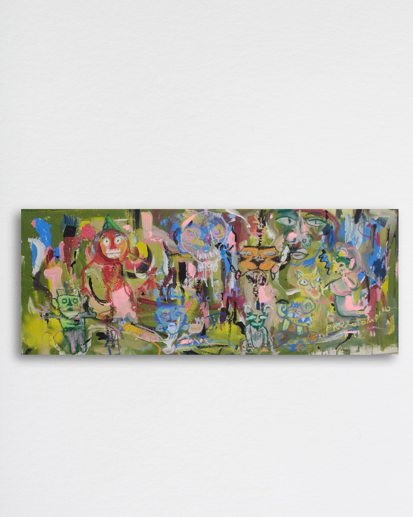 “Ancestral Tribe” presents a series of enigmatic characters and figures, including faces, creatures and symbols that emerge from a green and multicolored background. With an expressionist style, the painting captures the essence of a surreal universe where the real and the imaginary intertwine.