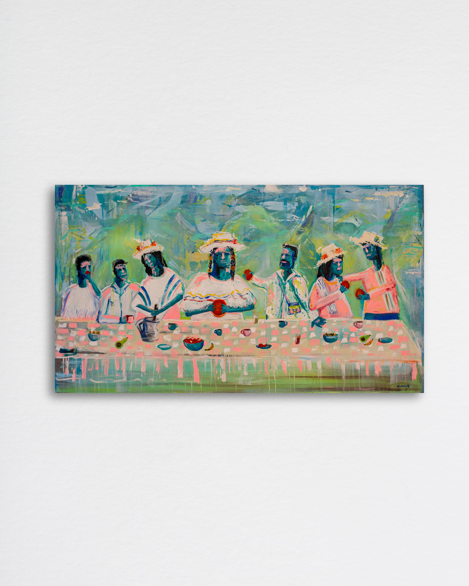 "Última Cena Paisa" captures the essence of the buñuelo tradition in a Colombian landscape, where the paisas gather to enjoy this iconic and delicious snack.